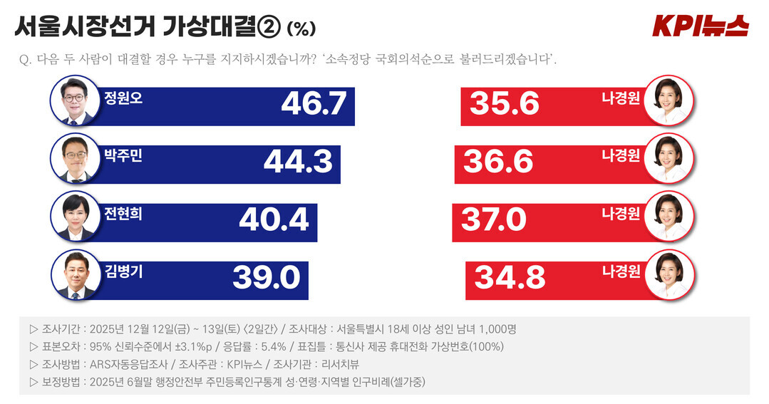 지역적으로 국민의힘 텃밭인 서울 강남권(강남 서초 송파 강동)에서도 정원오 51.3%, 오세훈 38.5%로 정 구청장이 오 시장을 두자릿수 격차로 앞서는 것으로 나타났다.