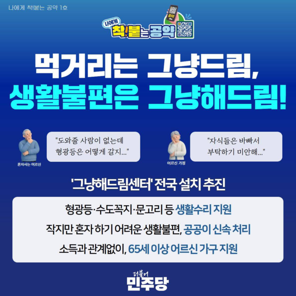 더불어민주당이 국민의 실생활과 밀착된 정책을 발굴하는 "착!붙 공약 프로젝트"의 1호 공약으로 "그냥해드림센터" 설치를 발표했다.