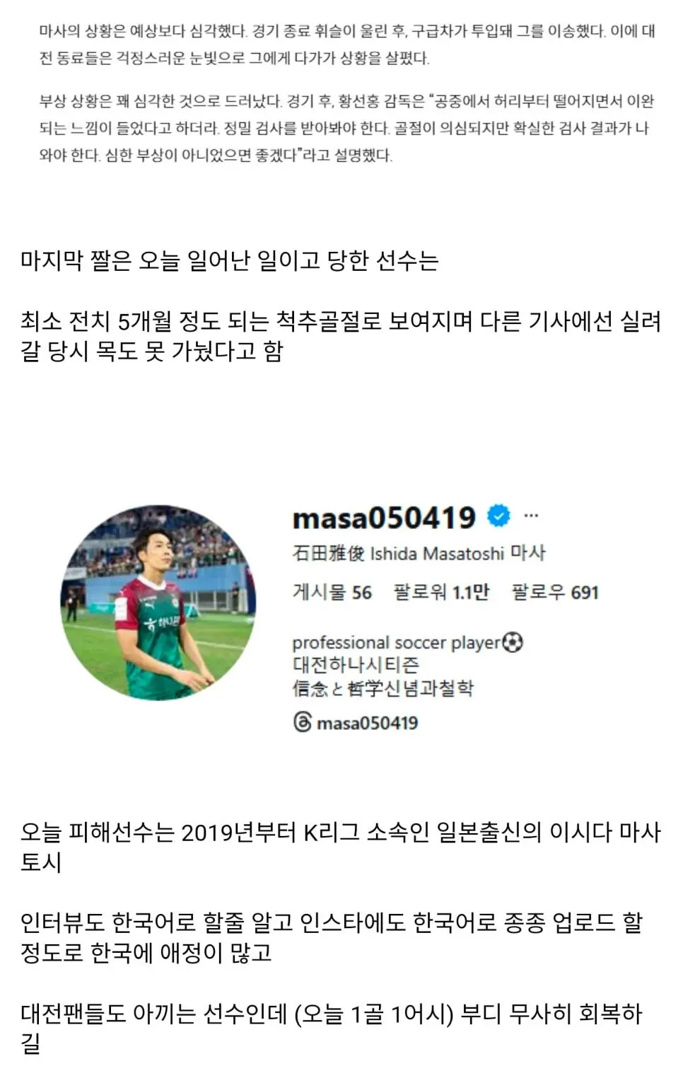 대전의 "마사" 선수가 공을 끌고가는데 난데없이