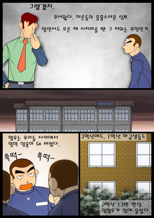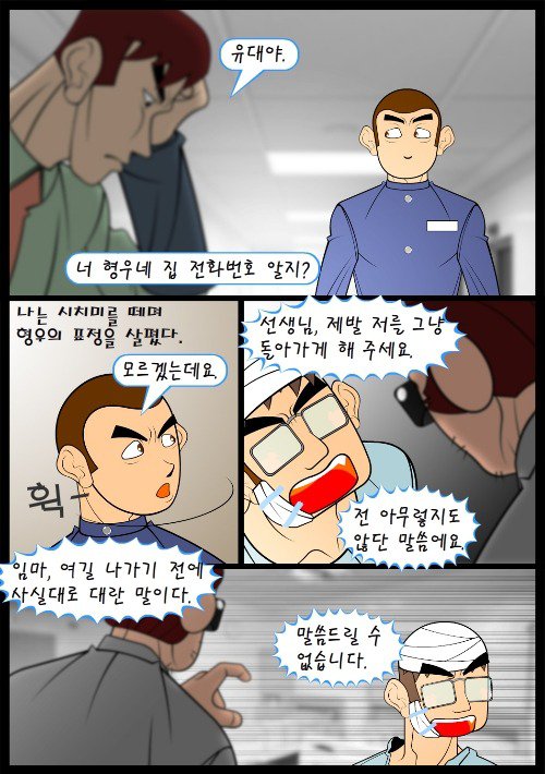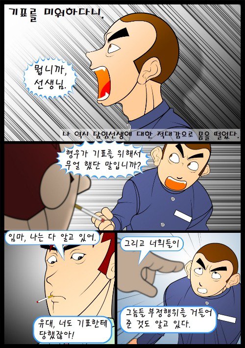 여기서 이유대는 최기표를 미워하는 담임에게 분노합니다.