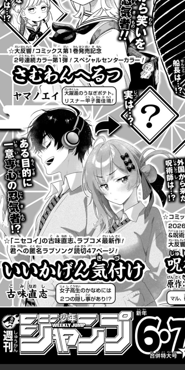 간단소개 2025년 12월 22일 월요일에 나온 주간소년점프 2025년 4,5호 권말예고에 의하면 2026년 1월 5일에 나오는 주간소년점프 5.6호에 실리는 니세코이 작가 코미 나오시 신작단편 비주얼이 떴다고 한다 이 정보는 합법적으로 나왔으며 작성자 본인이 소년점프 플러스에서 주간소년점프 전자판을 정기구독하고 있음