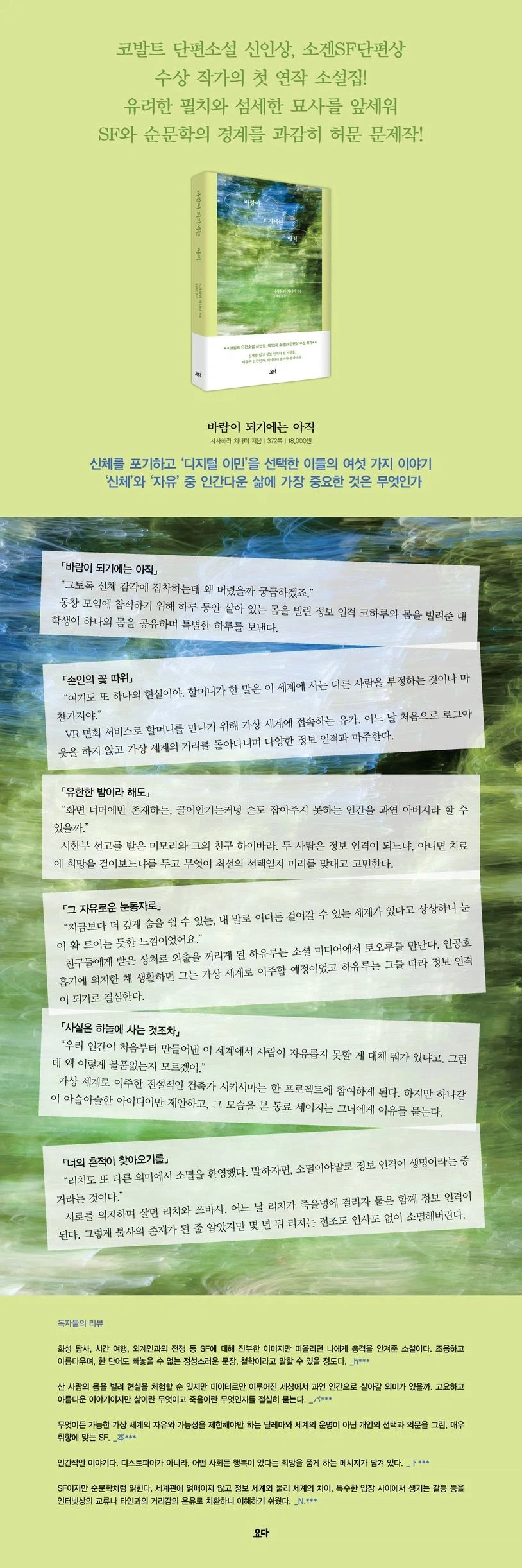 표제작 「바람이 되기에는 아직」에서 정보 인격인 코하루는 대학 동창 모임에 참석하기 위해 하루 동안 살아 있는 몸을 빌리는 서비스를 이용한다. 몸을 빌려준 사람은 나이 차이가 제법 나는 대학생. 하나의 몸을 공유하며 두 사람은 특별한 하루를 보낸다.