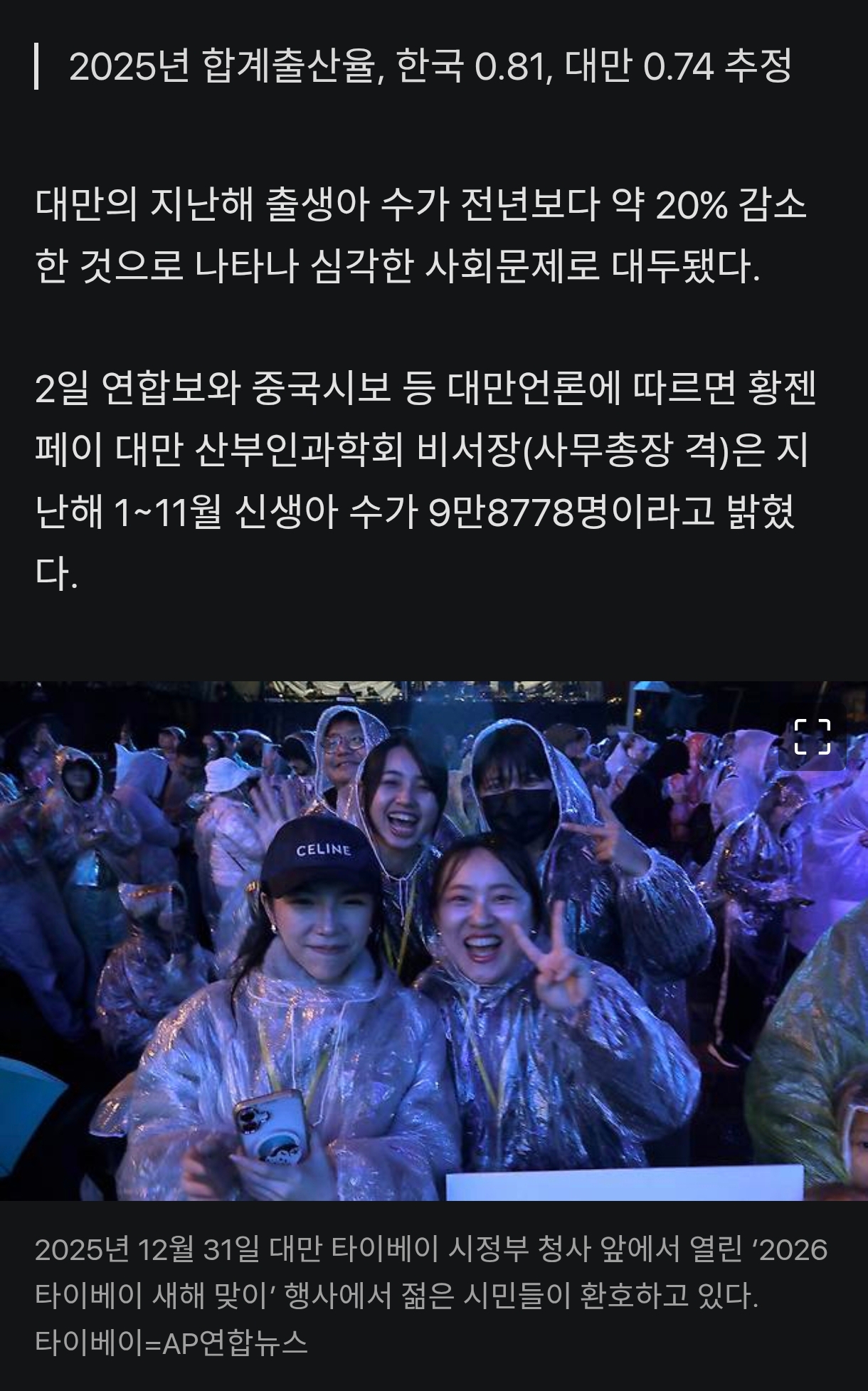 황 비서장은 작년 대만 신생아 수를 2024년 13만4856명에서 약 2만6000여명(약20%) 감소한 10만여명으로 추산하며 출산율이 ‘붕괴’ 수준이라고 풀이했다.